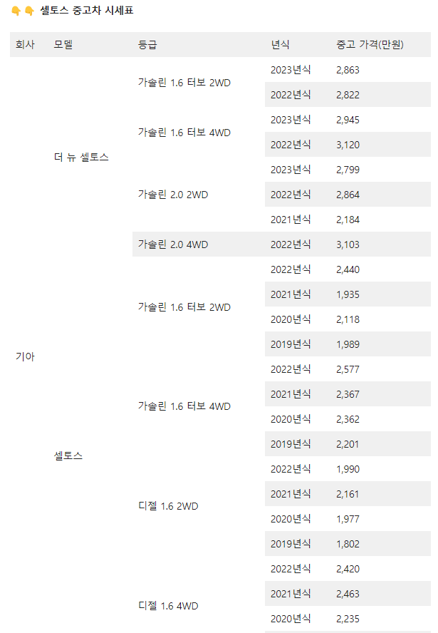 아래에는 셀토스 중고차의 가격 정보가 정리되어 있습니다. 신차와 중고차 가격을 비교해 보시고, 어떤 것을 선택할지 고려해 보시면 좋을 것 같습니다.