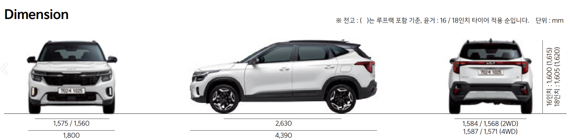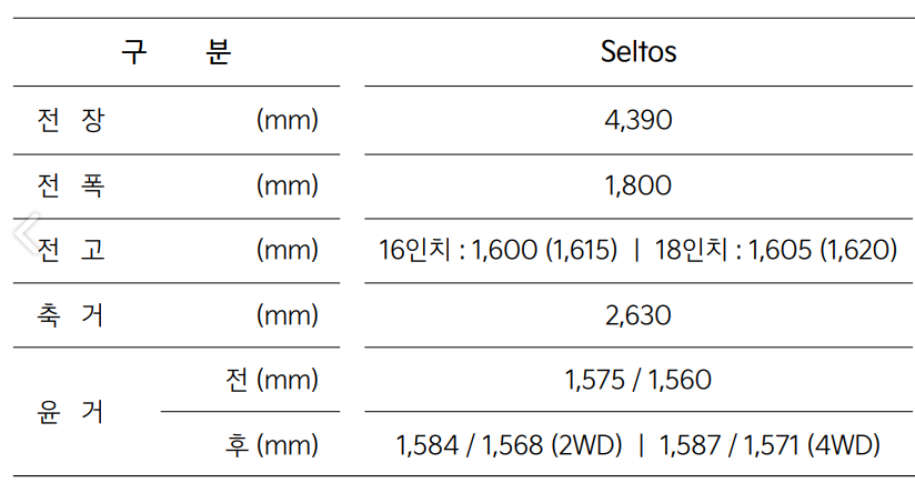 다음은 셀토스에 대한 제원표입니다. 차량의 성능과 규격을 알기 쉽게 정리해 놓았습니다.