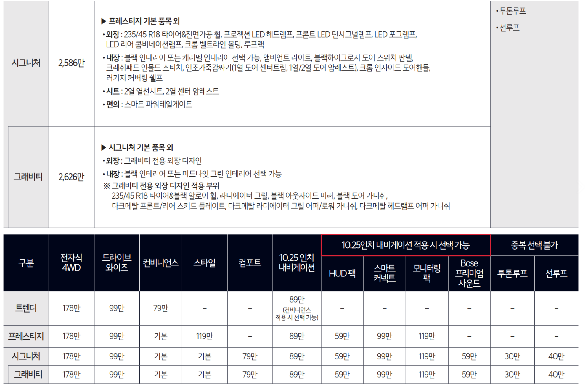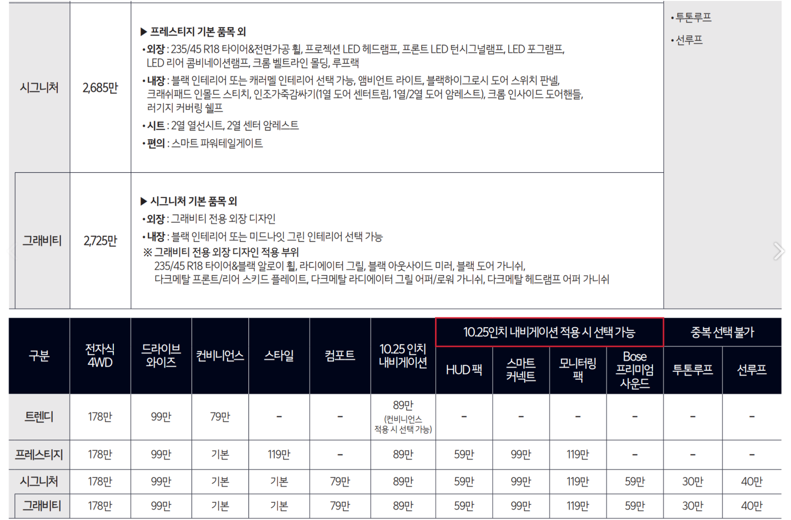 | 가솔린 터보 1.6 | 1,598 | 시그니처 | 4WD | 10.8 | 2,863 |