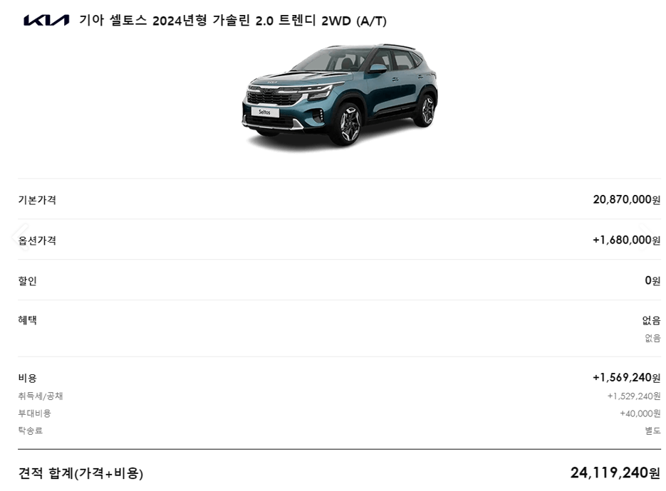 결론적으로 보면, 2024년형 셀토스의 신차 가격은 대략 2087만 원에서 2903만 원 사이입니다.