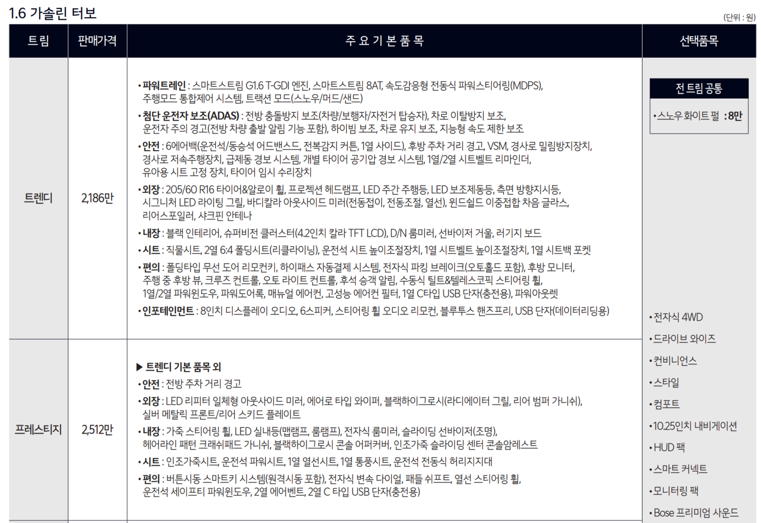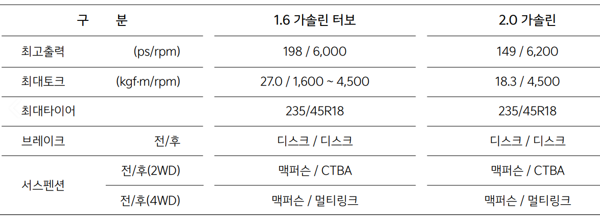 | 가솔린 터보 1.6 | 1,598 | 트렌디 | 4WD | 11.8 | 2,364 |