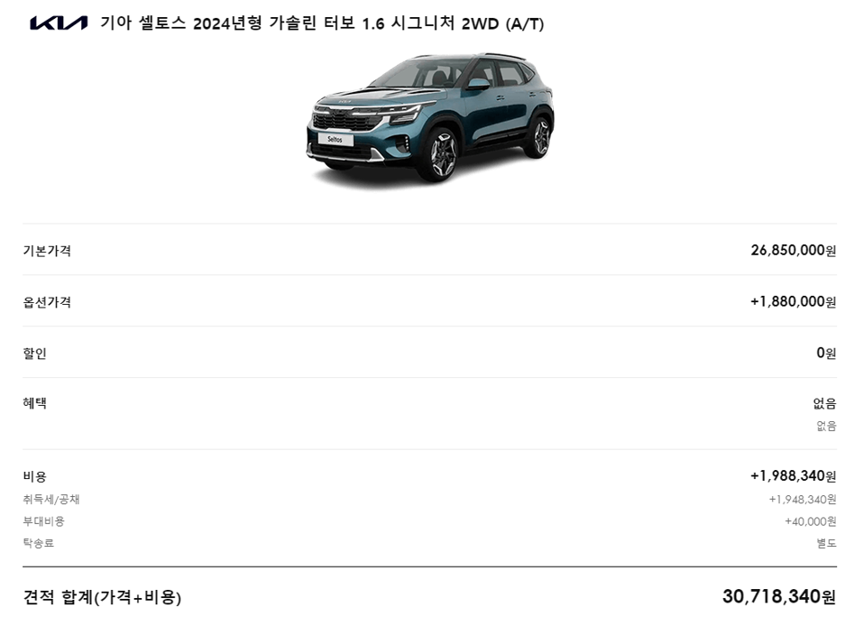 또한, 차량의 가격은 선택하는 옵션에 따라 변동할 수 있습니다. 아래에는 셀토스 신차의 견적을 간략하게 확인할 수 있으니, 참고하시면 도움이 될 것입니다.